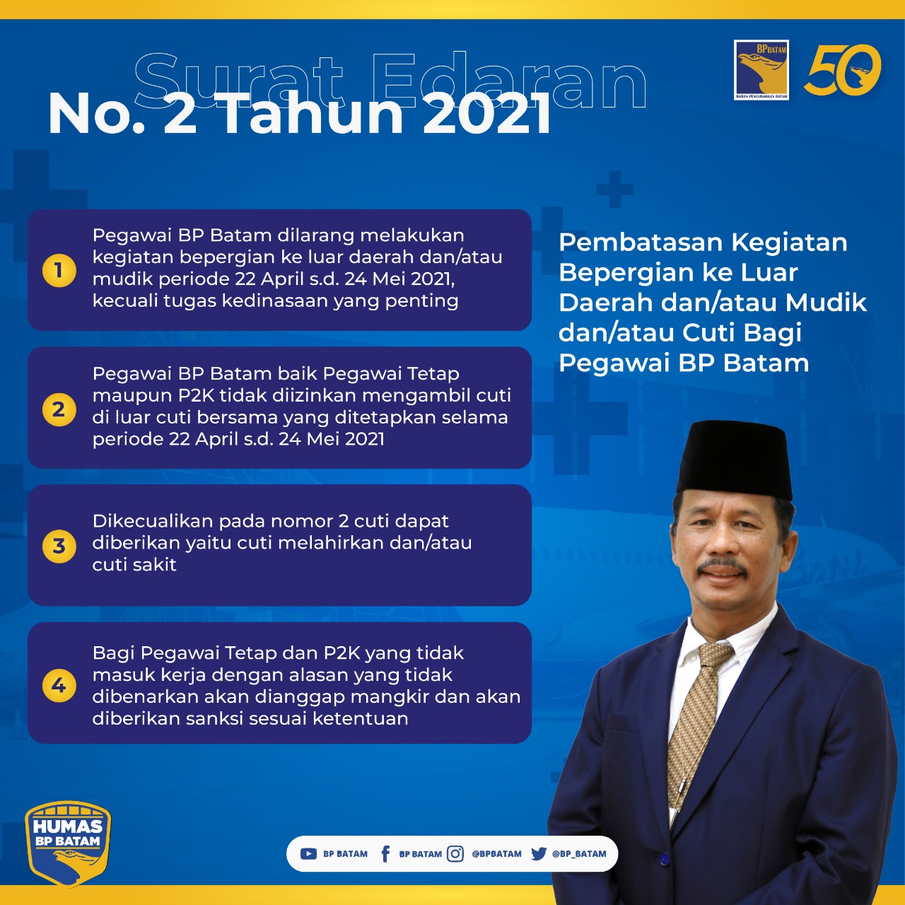 Hal ini juga menindaklanjuti Surat Edaran Kepala BP Batam Nomor 2 Tahun 2021 perihal pembatasan kegiatan bepergian ke luar daerah dan/atau mudik dan/atau cuti bagi pegawai di lingkungan BP Batam dalam masa pandemi Covid-19 pada Bulan Ramadhan 1442 H bagi Pegawai BP Batam, baik Pegawai Tetap maupun Pegawai P2K di Lingkungan BP Batam.