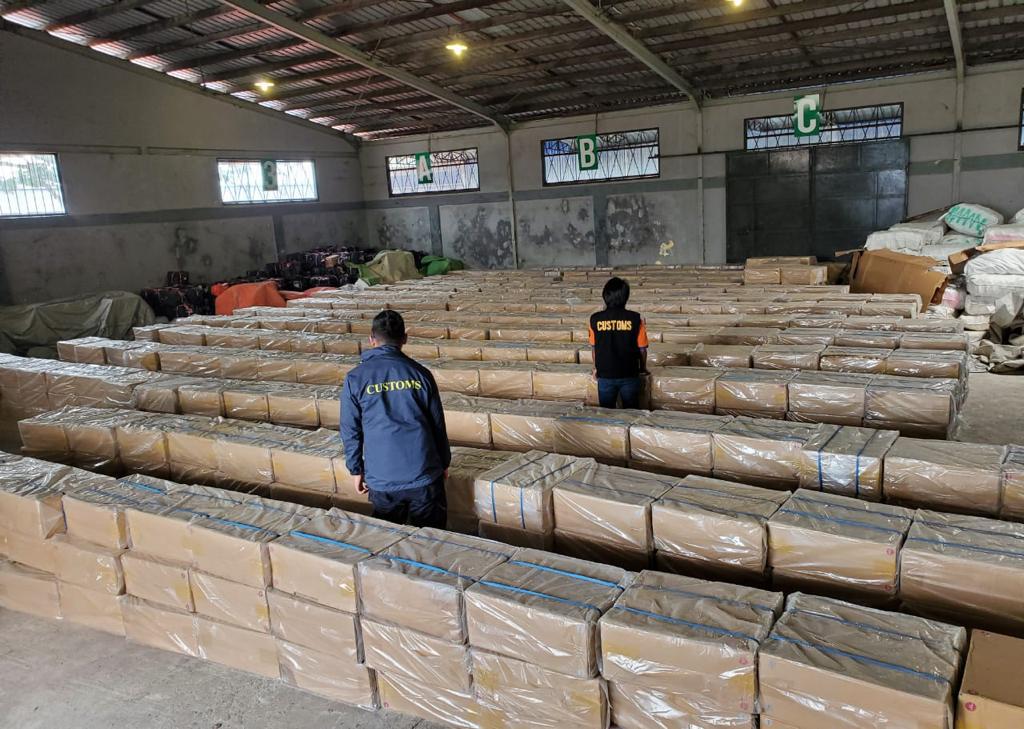 sejumlah tumpukan karton berisi rokok ilegal yang ditutupi terpal.Upaya para penyelundup melawan hukum dengan petugas Bea Cukai tidak berhenti di situ.
