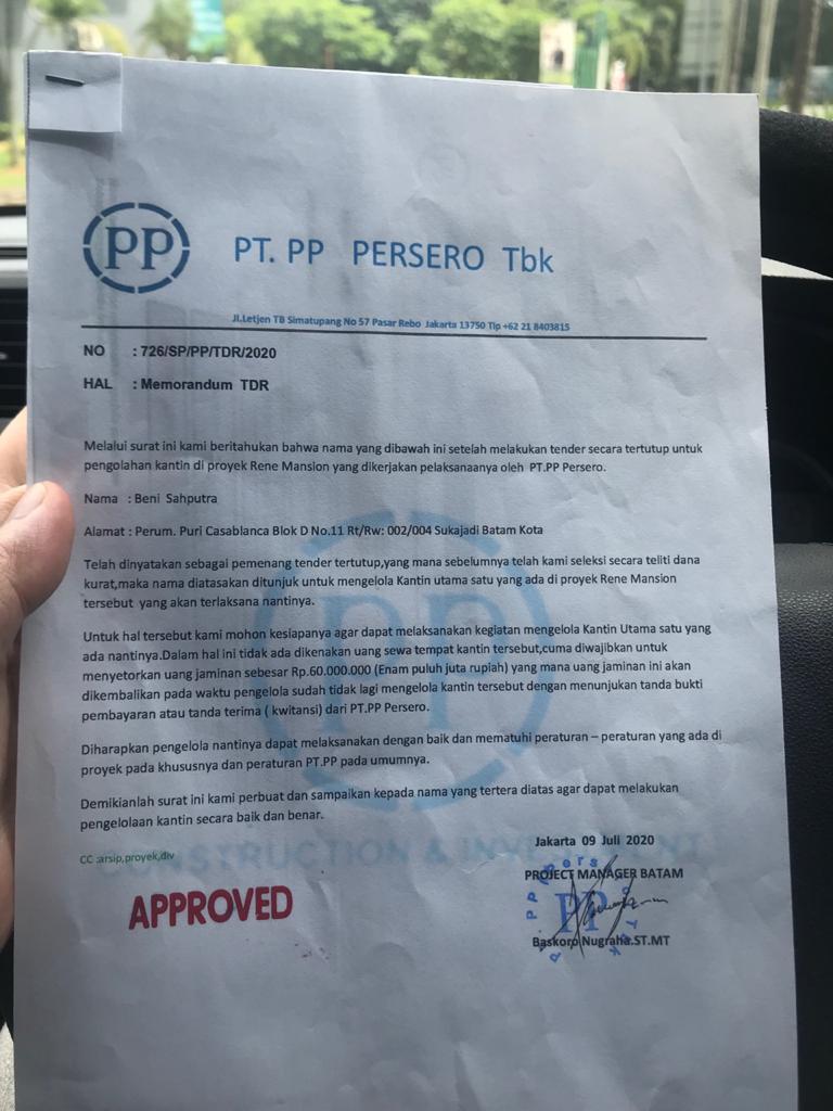 Untuk meyakinkan pemilik kantin, pelaku kemudian memberikan 1 lembar surat dengan KOP surat PT. PP yang ditanda tangani oleh Baskoro Nugaraha (Project Manager Batam).