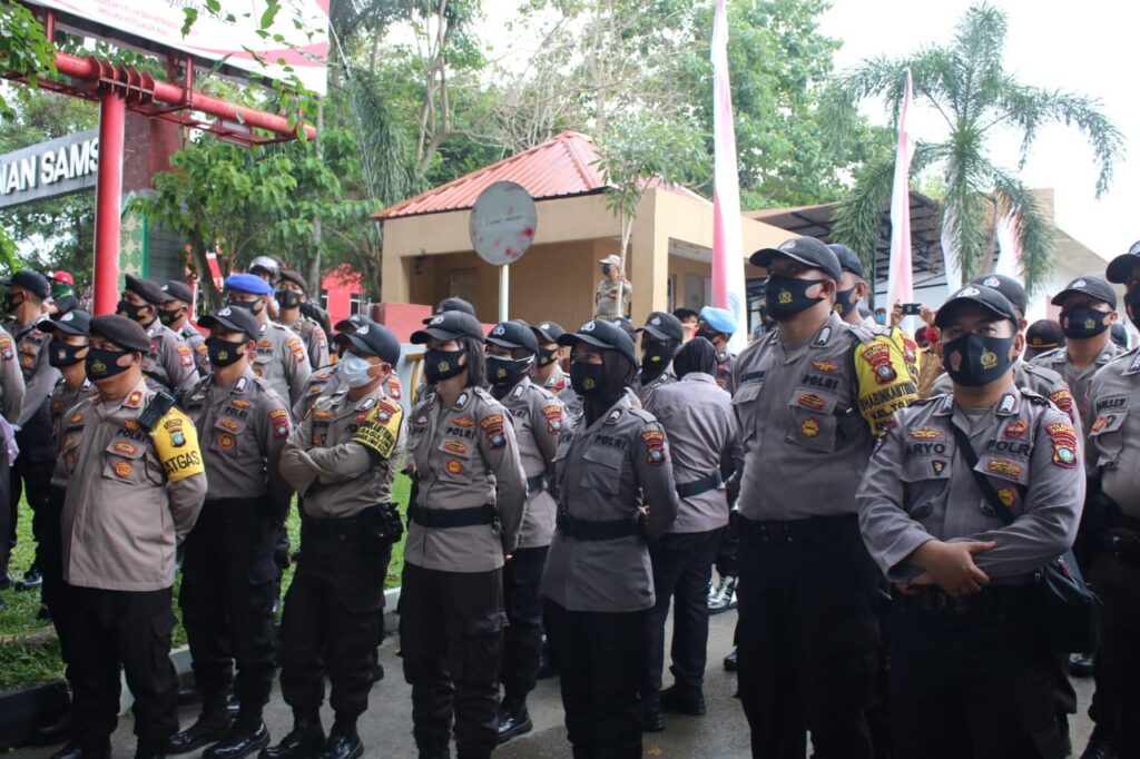 Aparat Kepolisian melaksanakan pengaman unjuk rasa buruh KF FSPMI di parkir Graha Kepri, Selasa (25/8/2020). (Photo:hms)